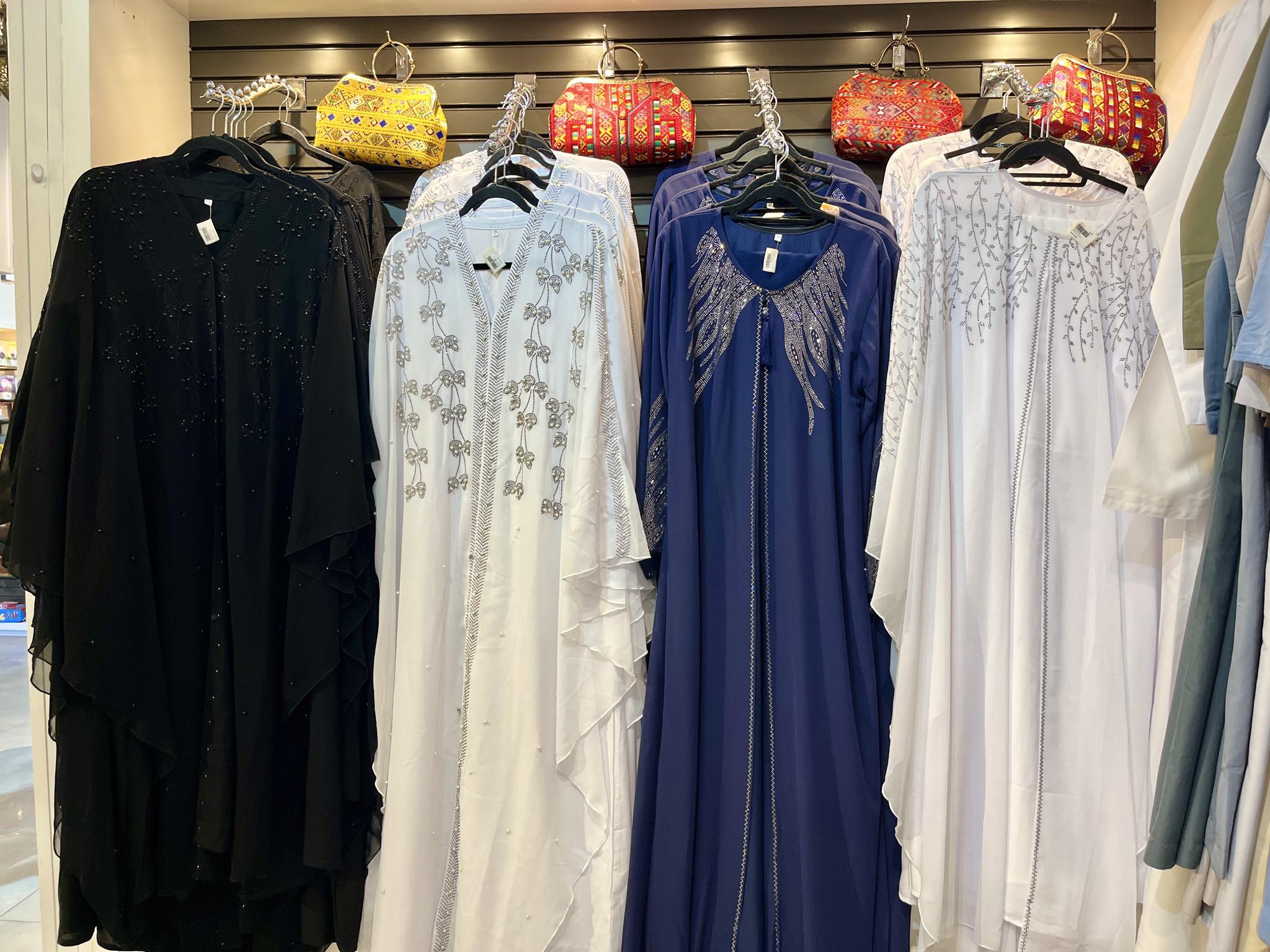 この写真(↑)の4列並びのアバヤは全てDhs. 369 ( 日本円で約14,800円 )で販売されていました。