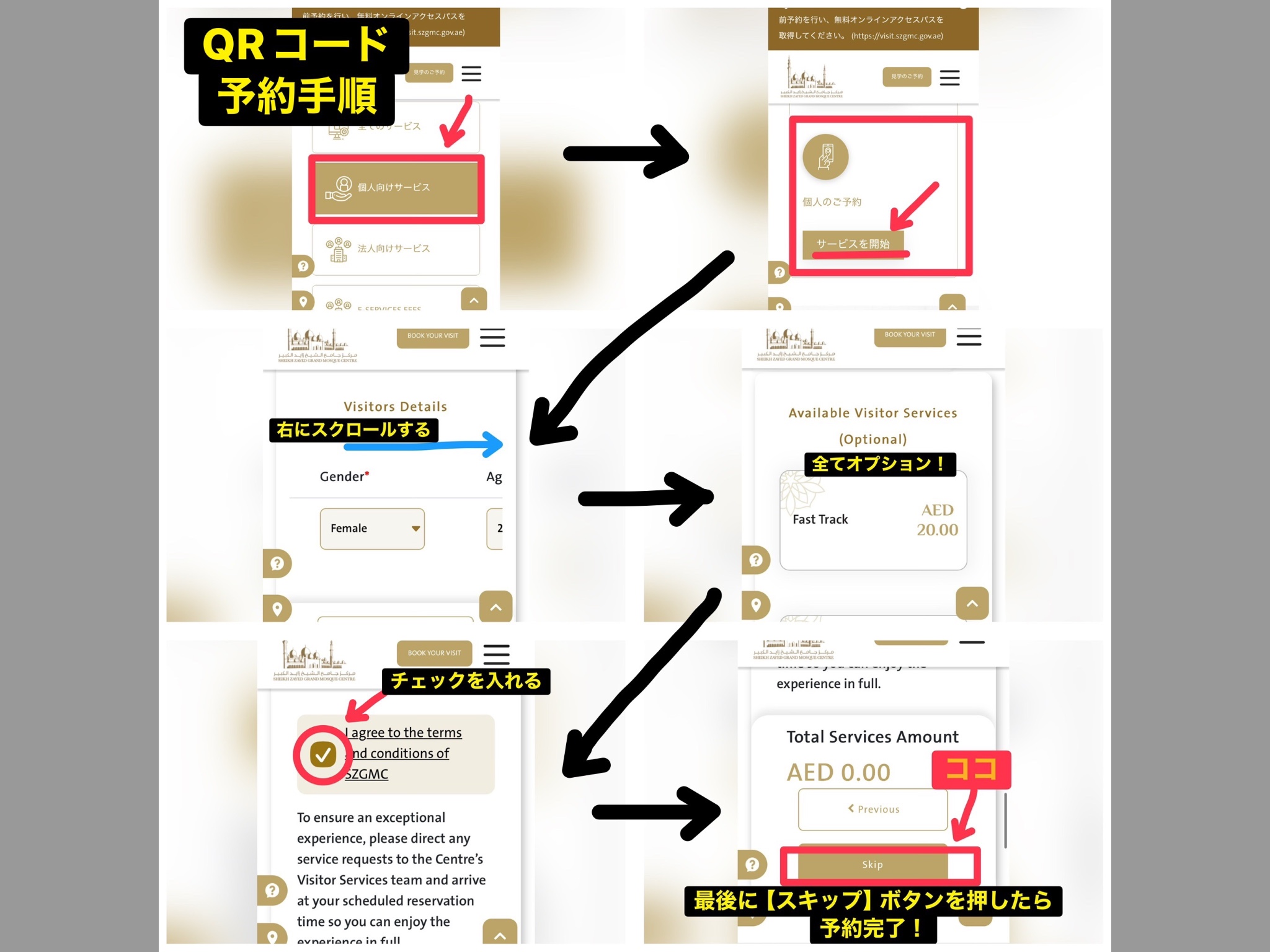 当日はモスクの入口で事前予約済みを証明するQRコードの提示をしないと入場ができない為、まずネットから事前に入場予約をします。