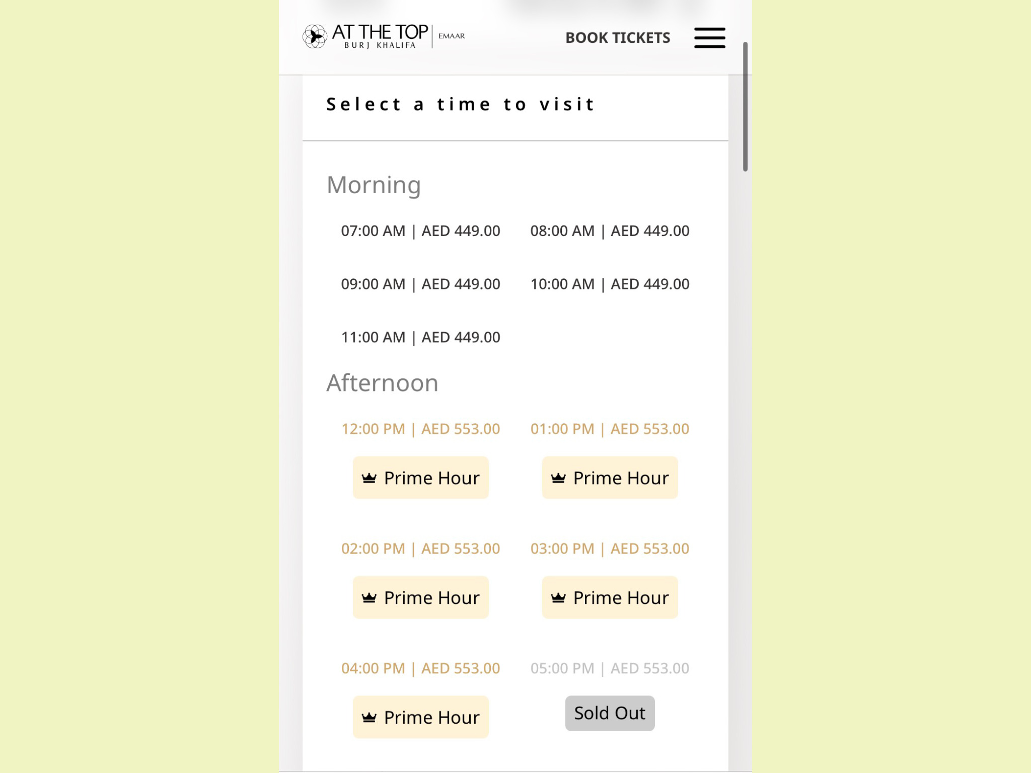 - ※お昼過ぎ~日没の時間帯までは値段が異なる【プライムアワー】大人Dhs. 259(約10,400円)/子供3歳~8歳Dhs.165 (約6,600円)
