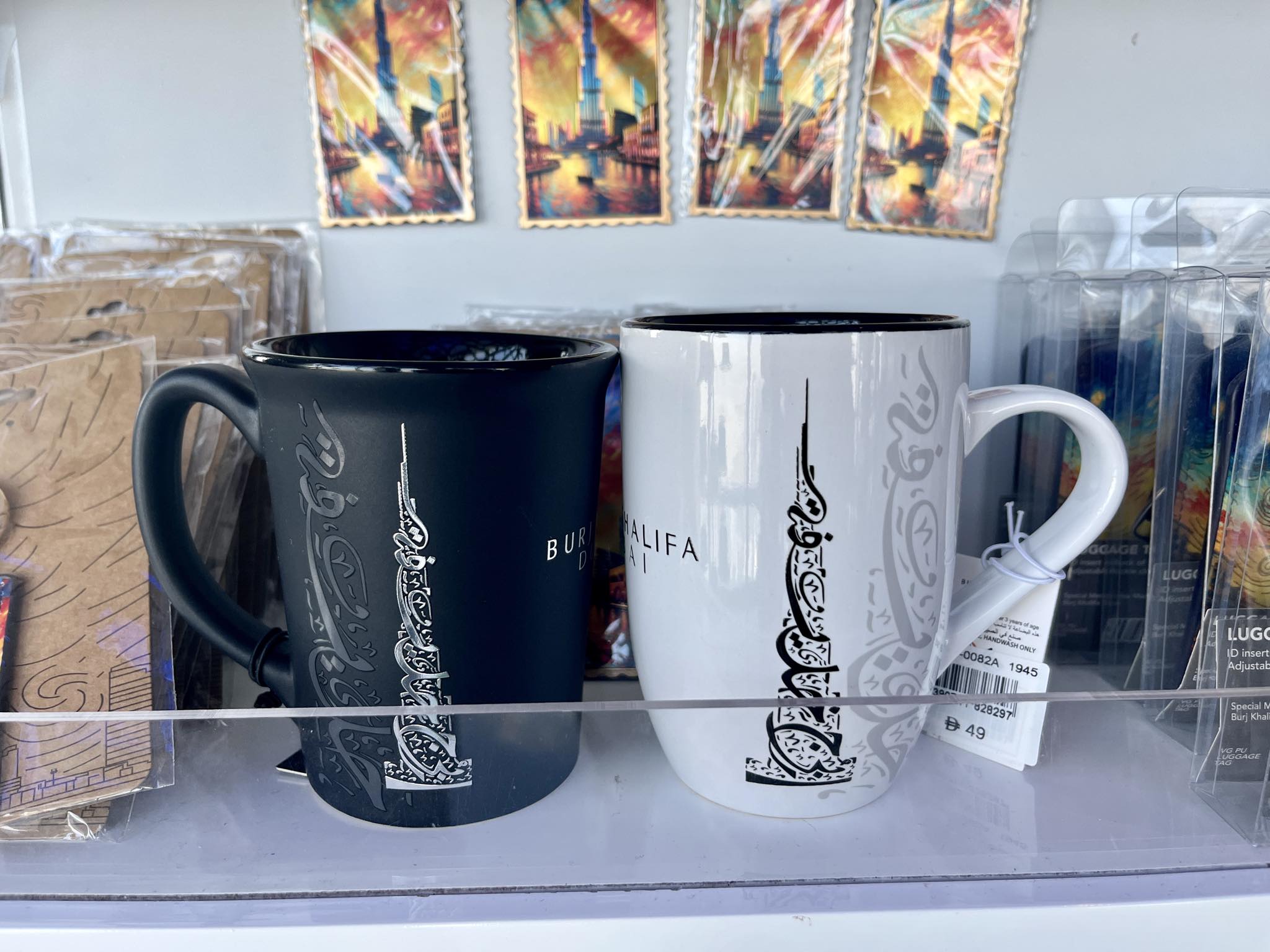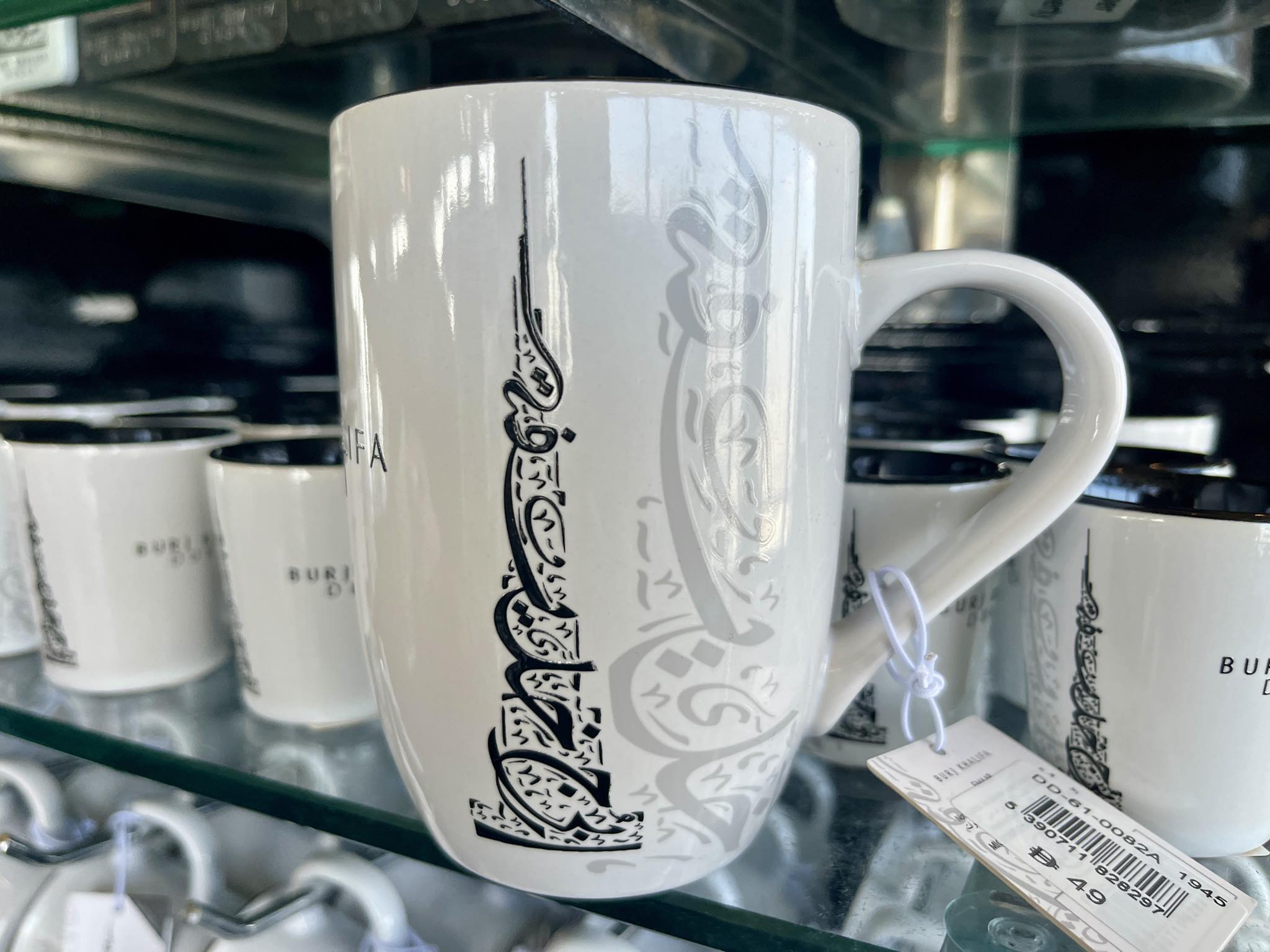 アラビア語の書道にあたる「カリグラフィー」の手法で書かれたマグカップは1個Dhs.49(日本円で約2,000円)。