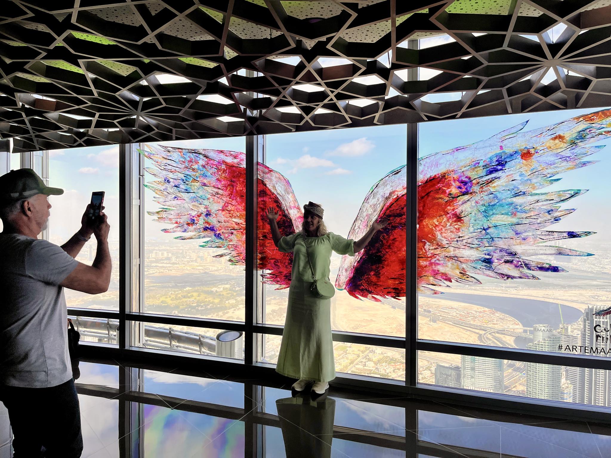- 154階は、オープンデッキ(女性の肩の高さから上にはガラスが無くオープンエア)なので、綺麗な風景写真が撮れます(148階と124階の屋外デッキはガラス越しのみ撮影可)