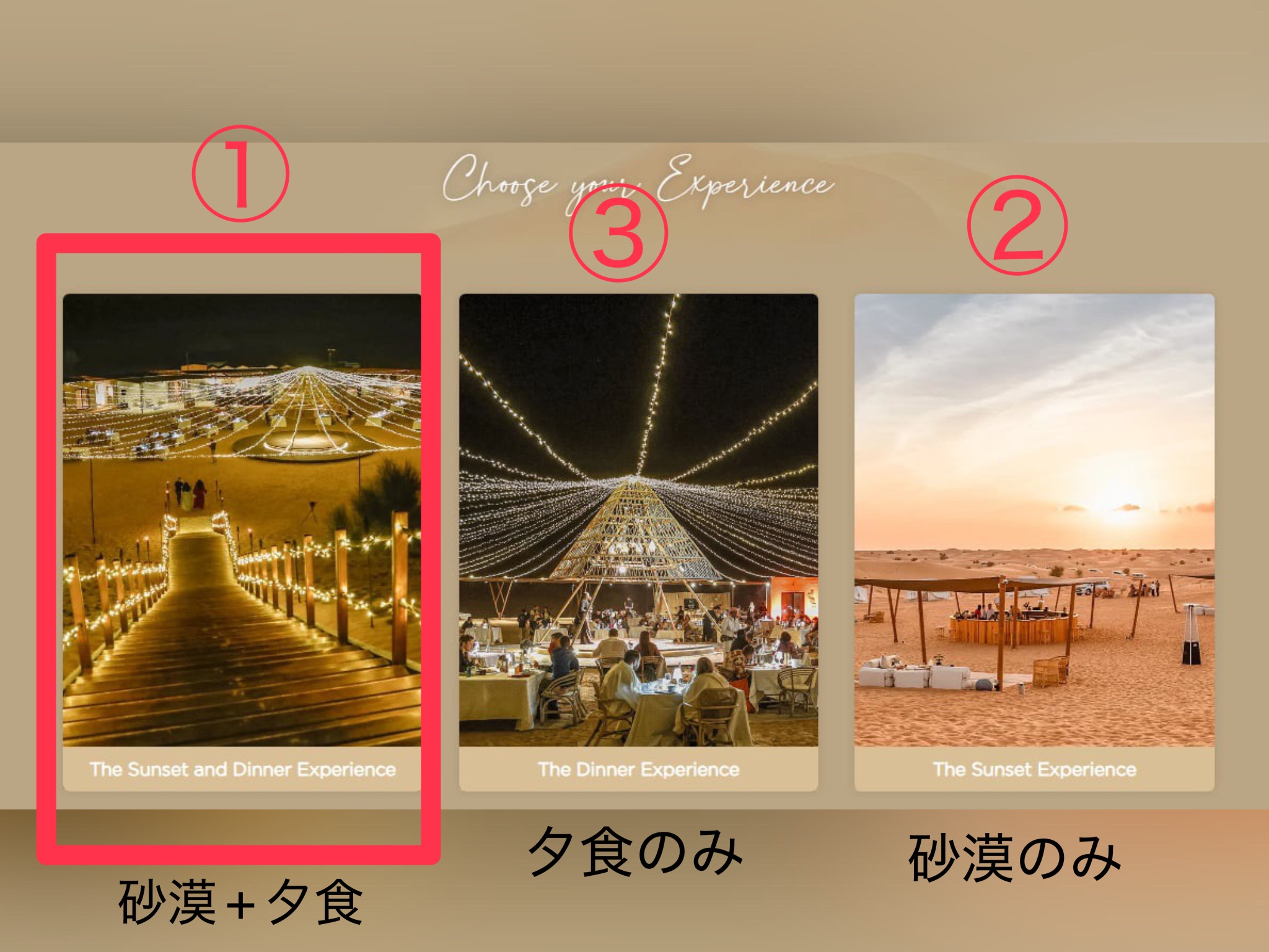 【The Sunset and Dinner Experience】サンセット砂漠体験と夕食付、を選ぶと全部のアクティビティーが楽しめます。