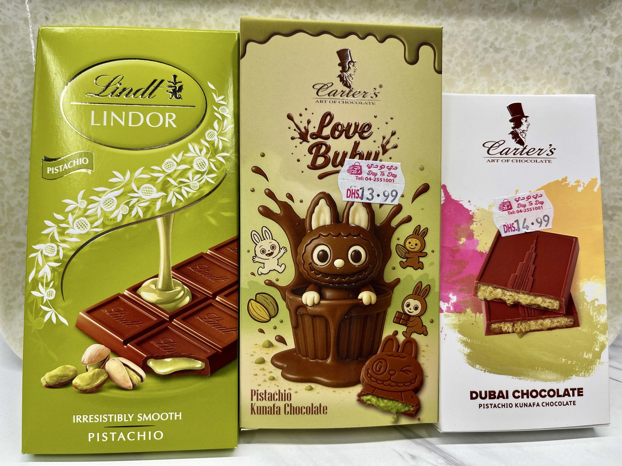 スイスの高級チョコ、リンツのドバイチョコレート(写真左側)は1個Dhs.12.99(日本円で約520円)。