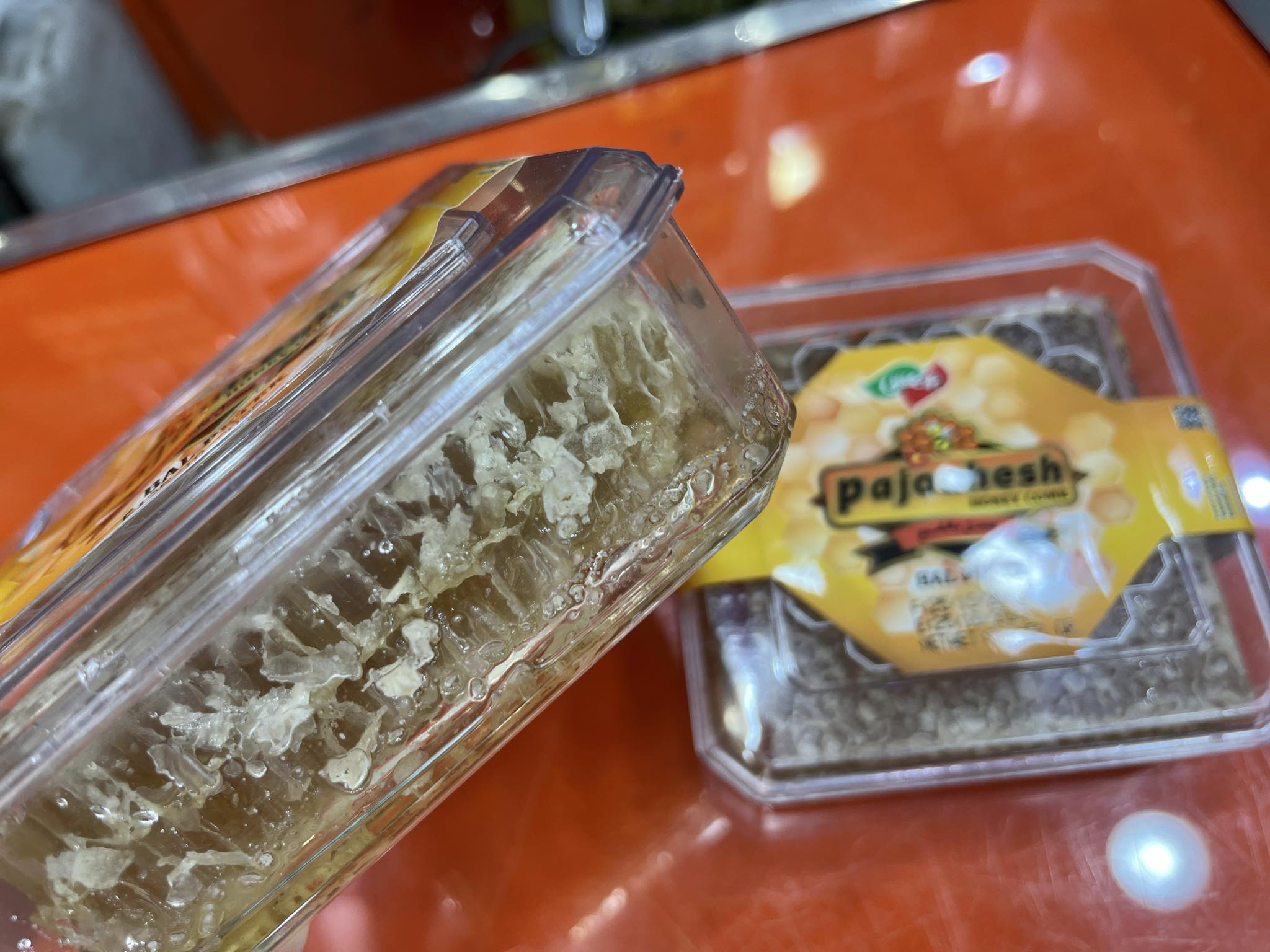 ハチの巣ごと入ったイラン産ハチミツ1個Dhs.20(日本円で約600円)。