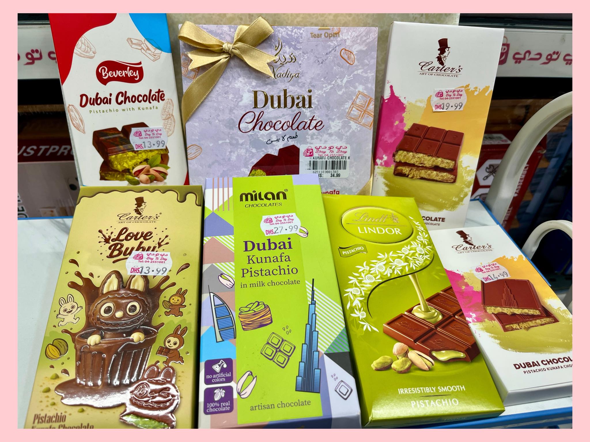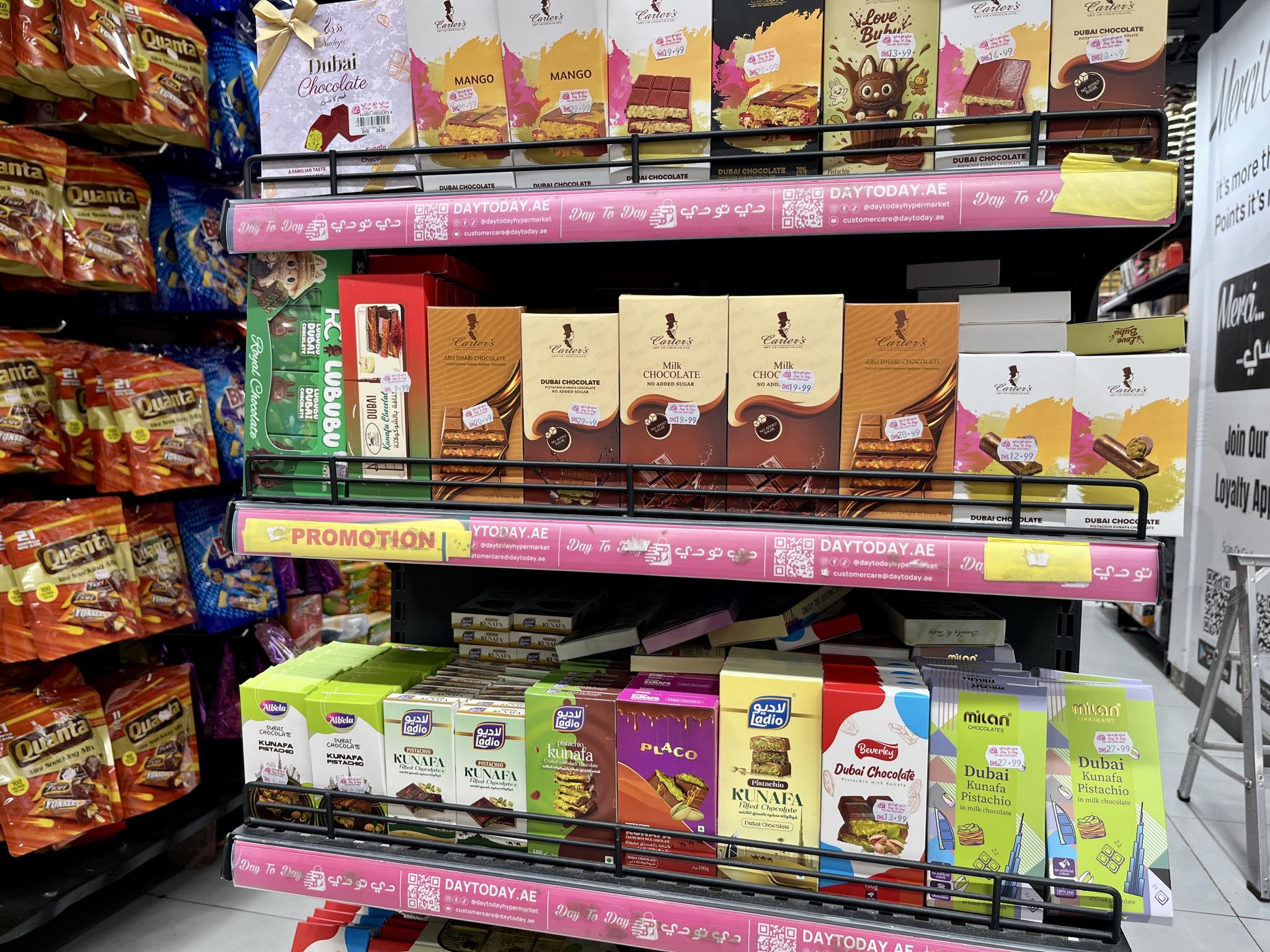 リビエラホテルから徒歩2分の24時間営業、大型ディスカウント店「 DAY to DAY 」には目移りしてしまうほど、値段もお手頃なドバイチョコの種類が並びます。